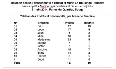 En ce beau 21 juin 2014, cinquante des 137 «Mohicans» étaient inscrits (et 49 présents: Jean-Claude L.B., malade, a dû renoncer) à la 4° réunion des 65+ descendants d’Ernest et Marie Le Boulengé et de leurs conjoint(e)s, à la Ferme du Quartier à Bouge.